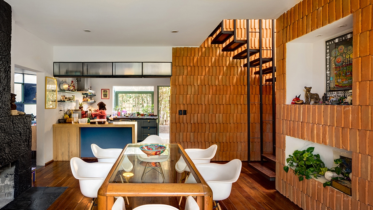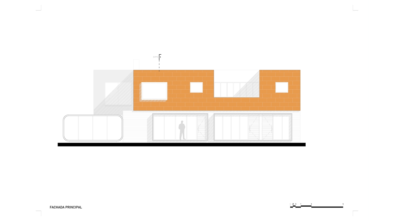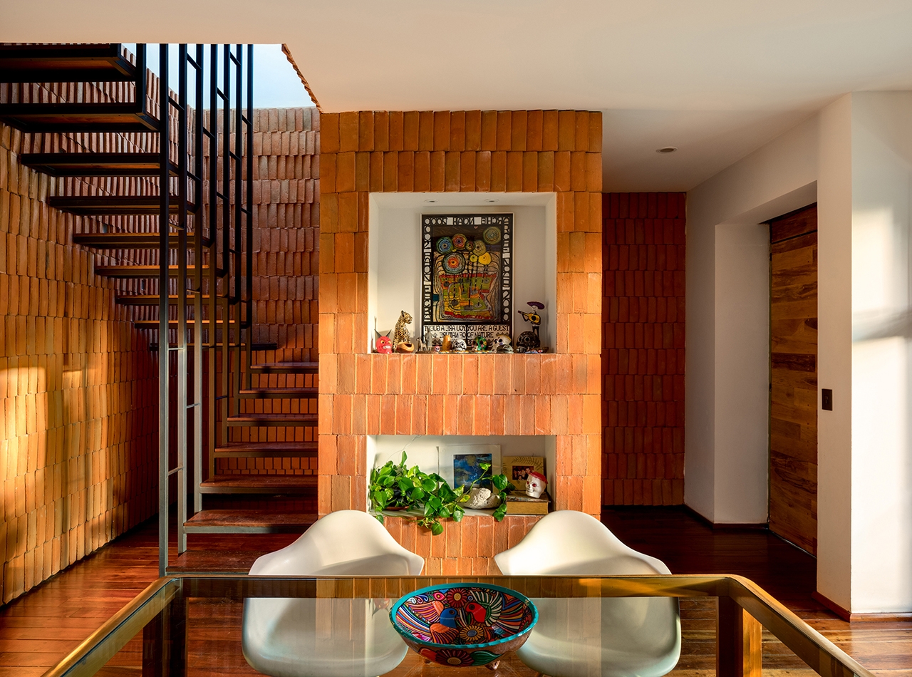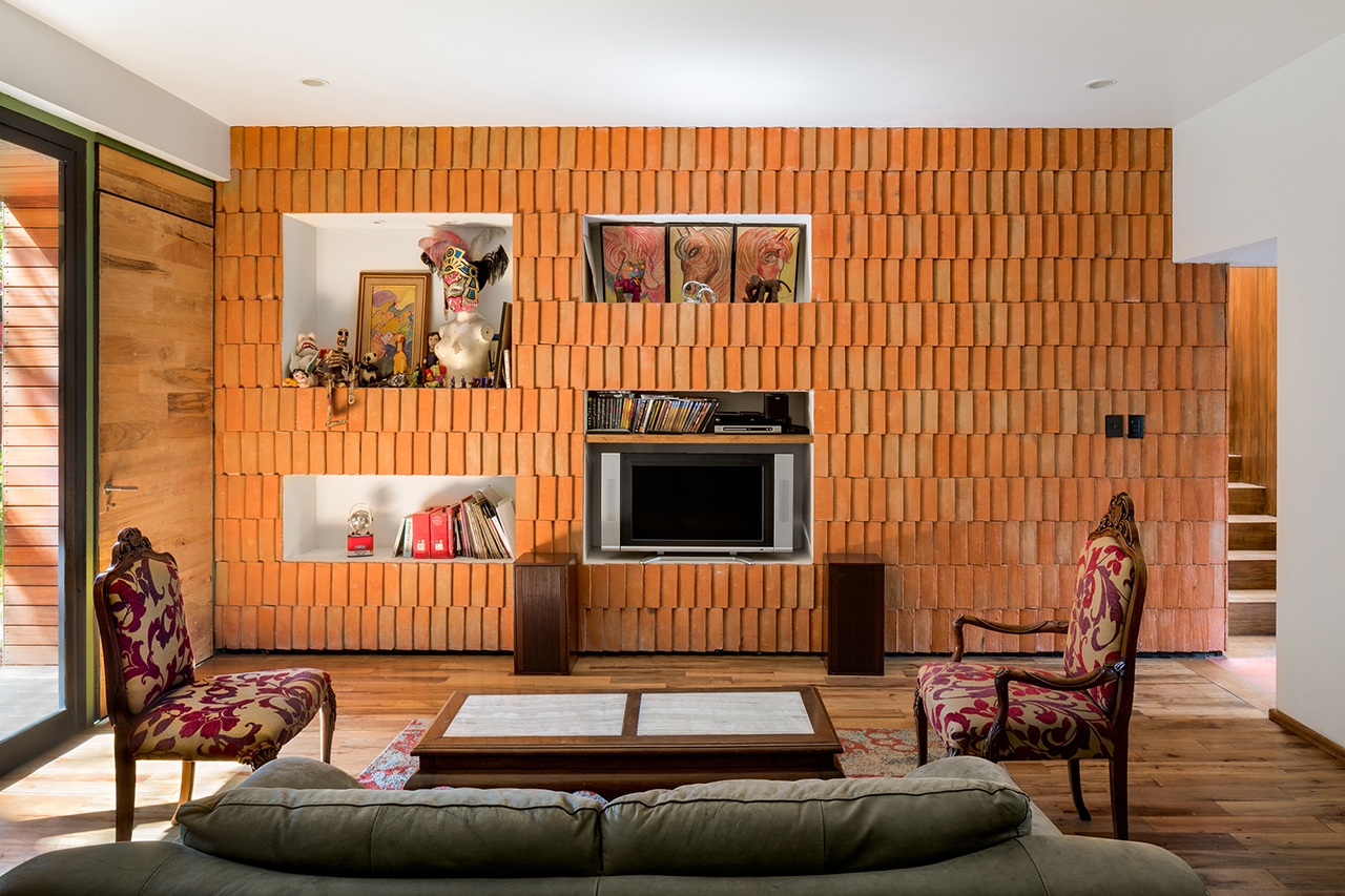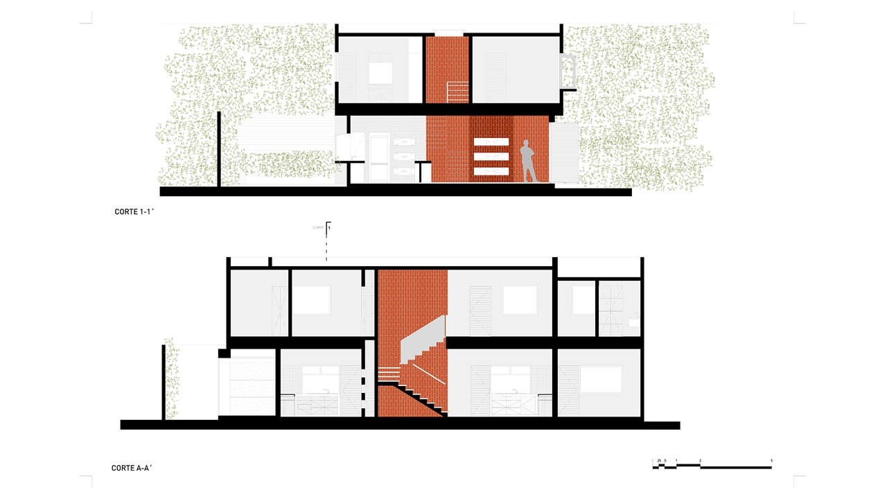 El muro servidor divide las dos viviendas en el sentido transversal de la casa original, este muro contiene los espacios sociales de la casa además de albergar las circulaciones verticales y espacios de servicio. La tectónica del proyecto se expresa con la recuperación de los acabados y elementos originales así como con el uso de un solo nuevo material, el ladrillo. La imagen exterior de la casa se sigue leyendo como una sola unidad que con ligeras sugerencias expresa el programa interno de cada vivienda.