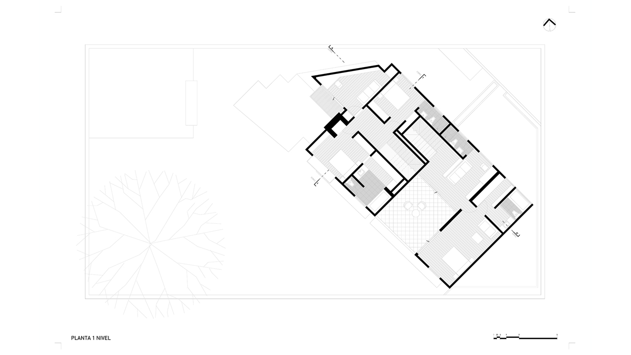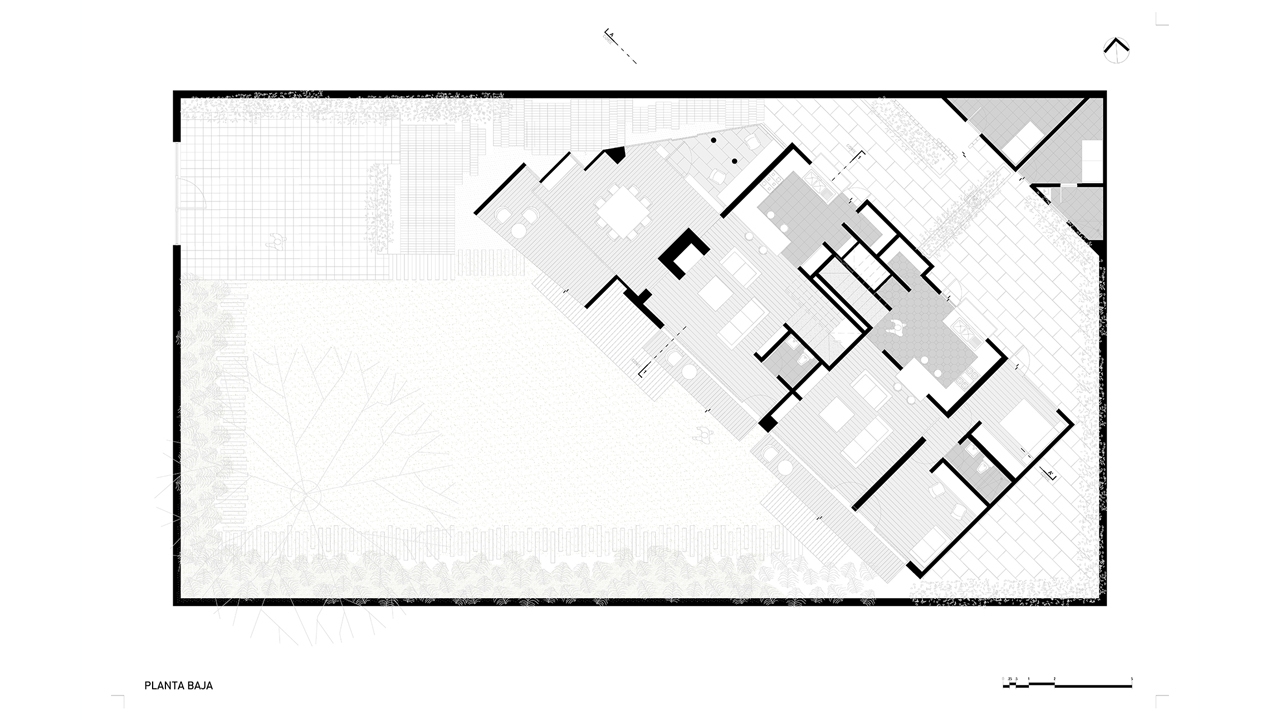 La casa original se desplanta en el extremo oriente del predio cubriendo la menor área posible y gozando de las vistas del jardín. De amplios espacios y alturas generosas el programa original de la casa para una sola familia se fragmenta en dos unidades que albergan un nuevo uso de mayor complejidad.
