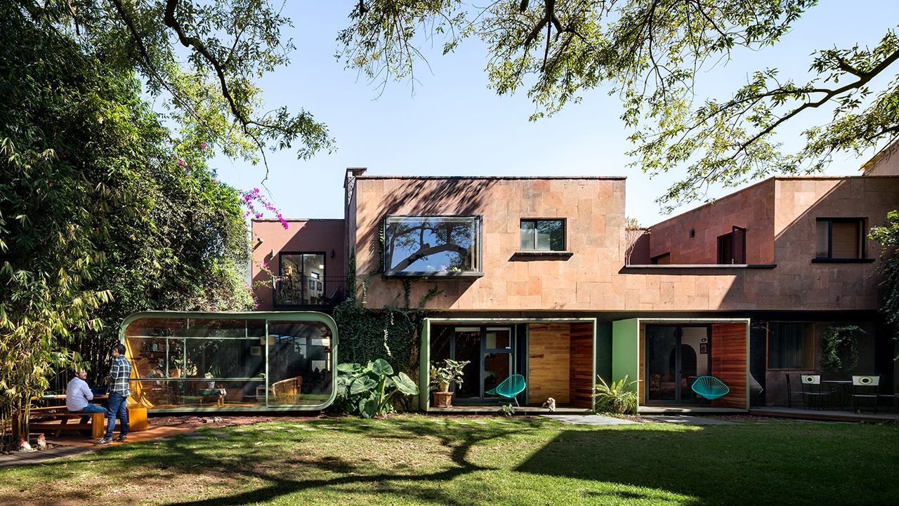 Ubicado en la colonia del Carmen Coyoacán dentro de un lote ajardinado de 720 m2 de proporciones rectangulares y de orientación oriente poniente, se encuentra la vivienda para dos familias independientes. Un árbol de fronda mayúscula, un jardín de garras casi prehistóricas y unas piedras monolíticas abrazan y contienen la construcción de una casa sexagenaria con nuevos requerimientos para alojar estas nuevas familias.