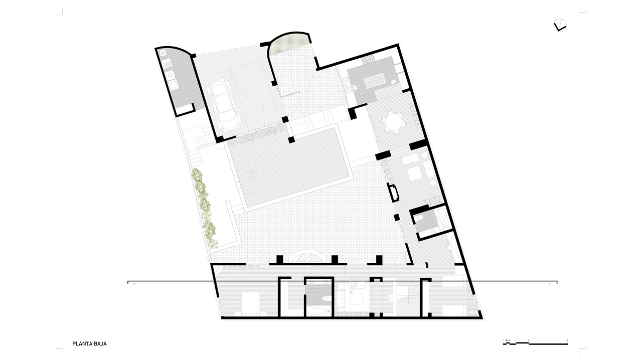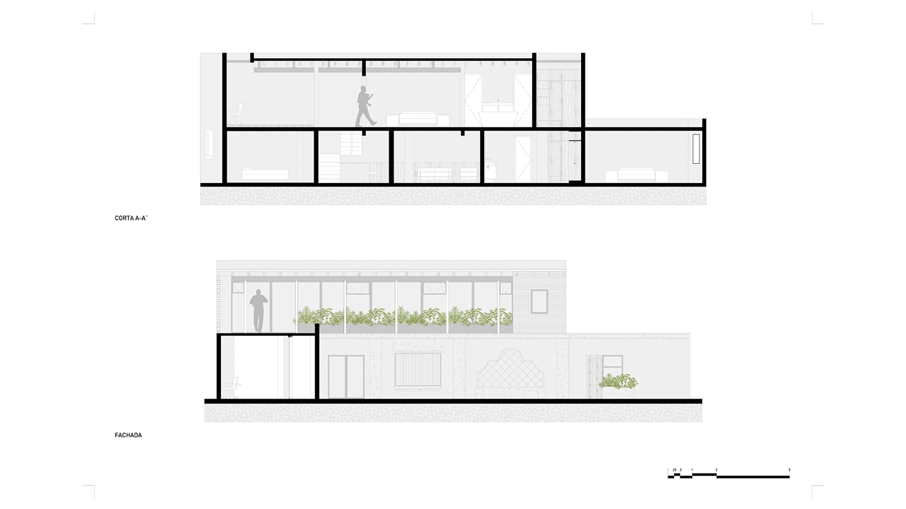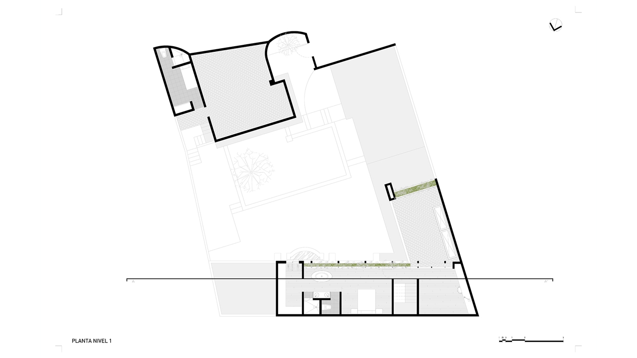 La estrategia de intervención de la planta existente fue de acciones de acupuntura que renovaran la estética y nivel de confort. Contrastado con esto, la acción mayor fue la suma de un nivel más que alojaría un nuevo espacio de estudio y recamara principal. Sin embargo, esta operación también se hizo con gran sensibilidad hacia la casa existente abriendo un gran ventanal hacia el patio y árbol central. La premisa rectora fue la de conservar la estructura principal y transformar el espacio para cumplir con los nuevos requerimientos del cliente. La tectónica del proyecto se expresa con los grandes muros y volumetrías masivas existentes, así como con la nueva intervención de carácter más ligero y transparente, pero con el uso de materiales familiares al recinto.