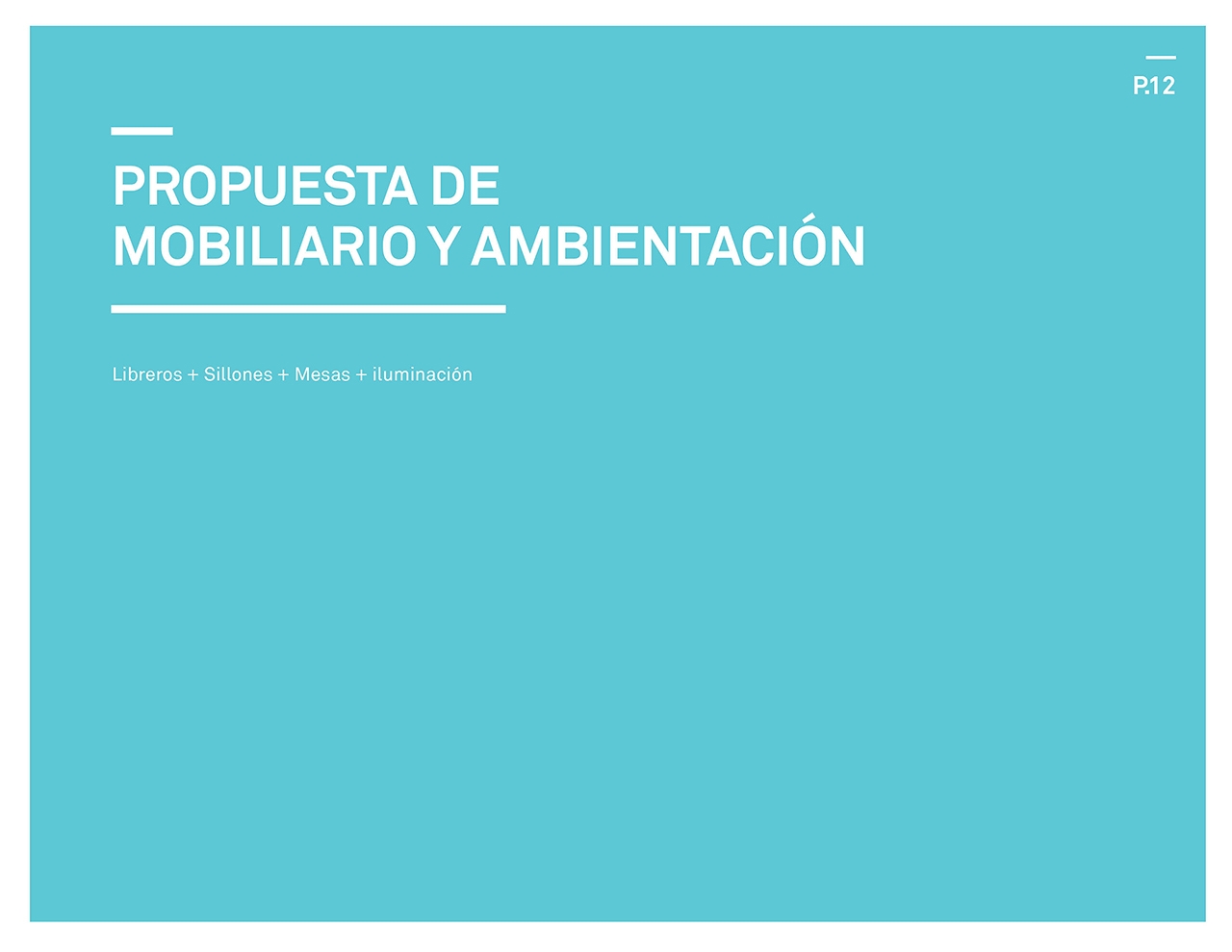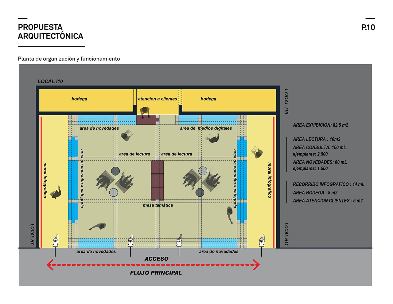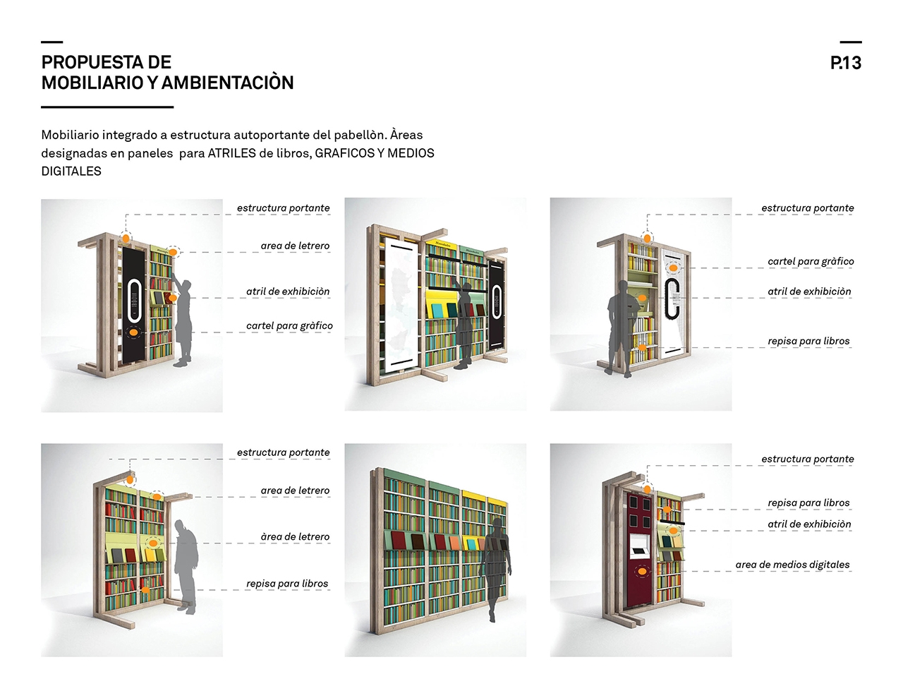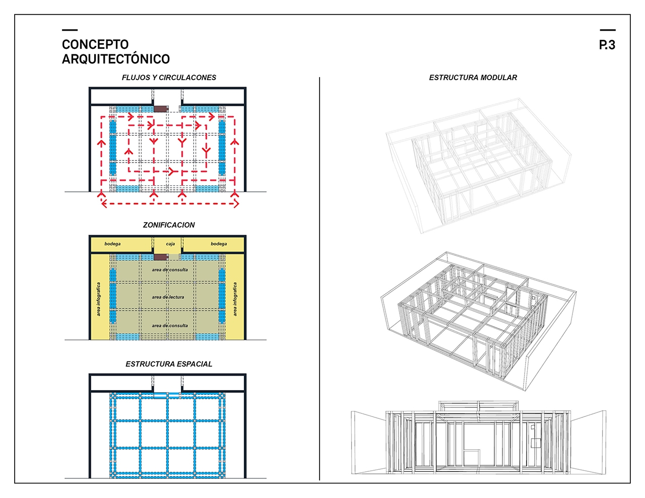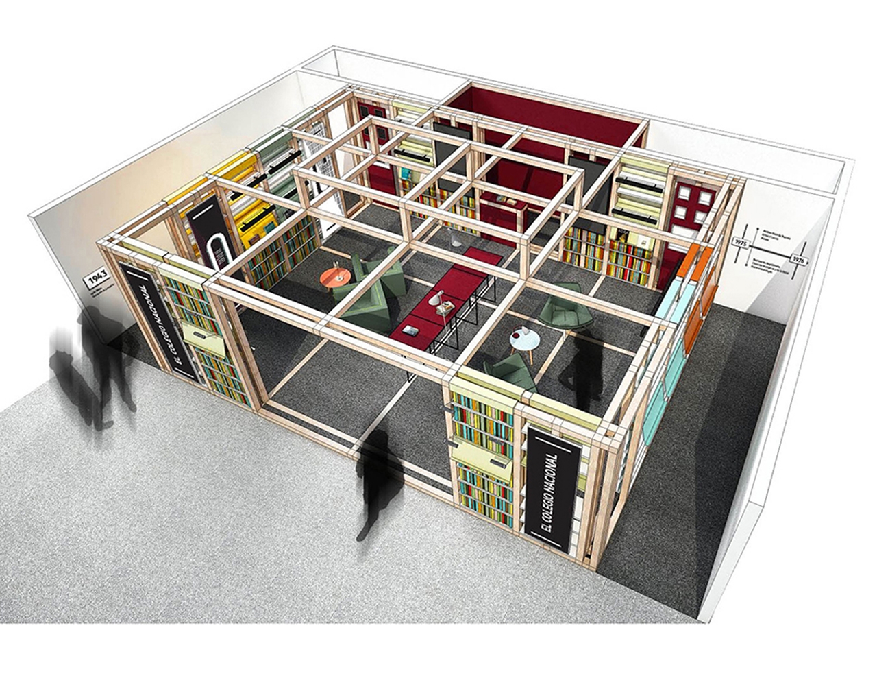 Una estructura modular se separa de los muros adyacentes para generar recorridos libres y azarosos a través de las distintas áreas requeridas por el programa. La estructura organiza el espacio y al mismo tiempo sirve de mueble y área de exhibición. Áreas de lectura, de exhibición de libros y mural infográfico se distribuyen dentro de la estructura distinguiéndose por su presencia y transparencia que invita al público a recorrerla.